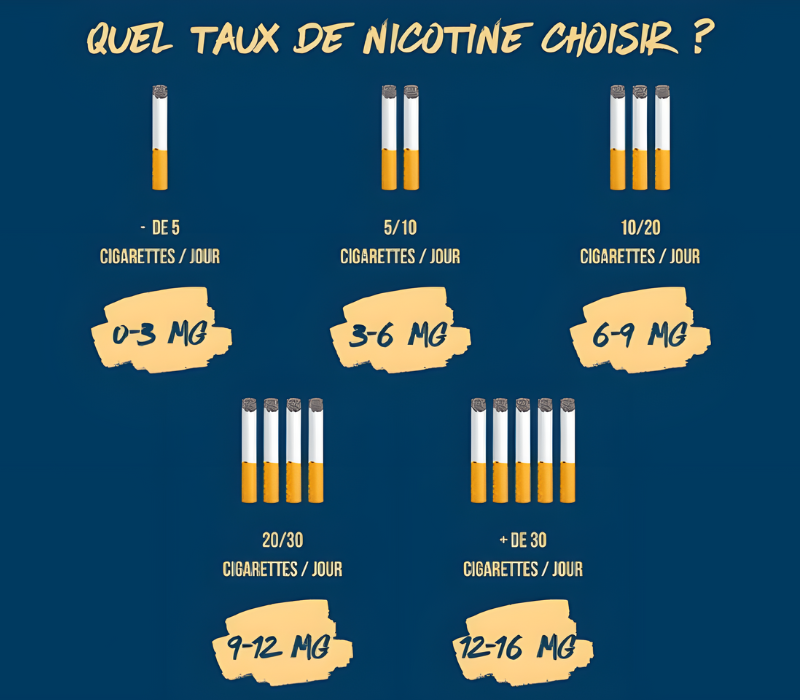 Si vous étiez un fumeur régulier, il peut être utile de choisir un taux de nicotine similaire à ce que vous consommiez avec les cigarettes traditionnelles. Un taux plus élevé en nicotine peut aider à satisfaire rapidement vos besoins en nicotine et à éviter les symptômes de sevrage. Si vous souhaitez progressivement réduire votre consommation de nicotine, vous pouvez opter pour un taux de nicotine inférieur à ce que vous consommiez auparavant. De cette façon, vous pouvez graduellement diminuer votre dépendance.