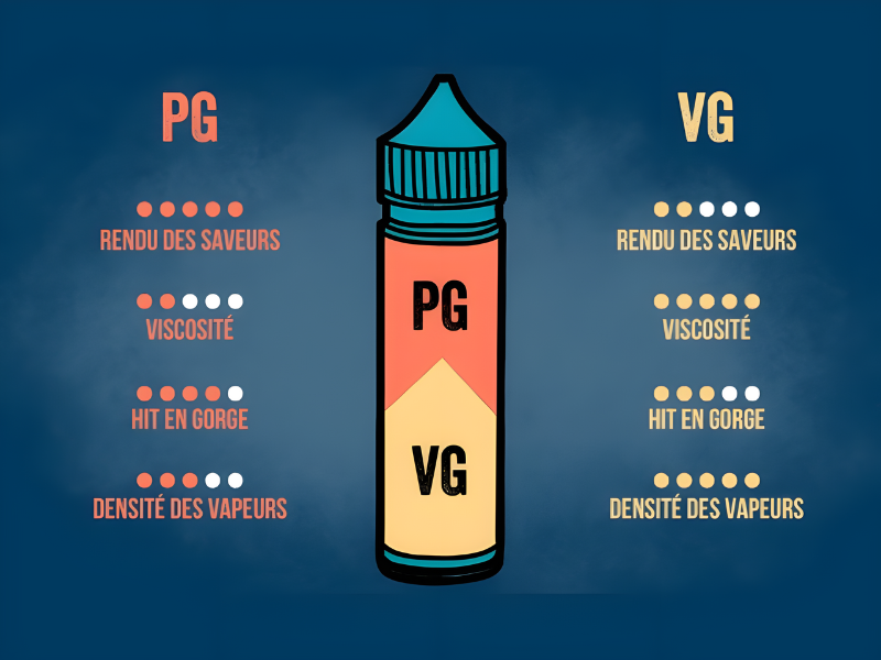 LE PROPYLÈNE GLYCOL (PG) : ce liquide incolore et inodore transporte les arômes, crée une sensation en gorge similaire à celle de la fumée de cigarette et favorise la vaporisation de l'e-liquide.