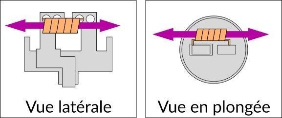 Il faut maintenant déterminer comment positionner la fibre ou le coton. Cela revient à se poser la question : d'où à où l'e-liquide va-t-il circuler ? Cette fois, c'est encore plus intuitif. On peut en effet déjà déduire un axe en fonction de l'alignement des pôles. Puisque le matériau capillaire va passer à l'intérieur de la résistance formée, le coton va donc dépasser de part et d'autre de la résistance en suivant le même axe.Une fois les pôles identifiés, on sait comment installer la résistance (orange). On peut en déduire l'axe (violet) du matériau capillaire.