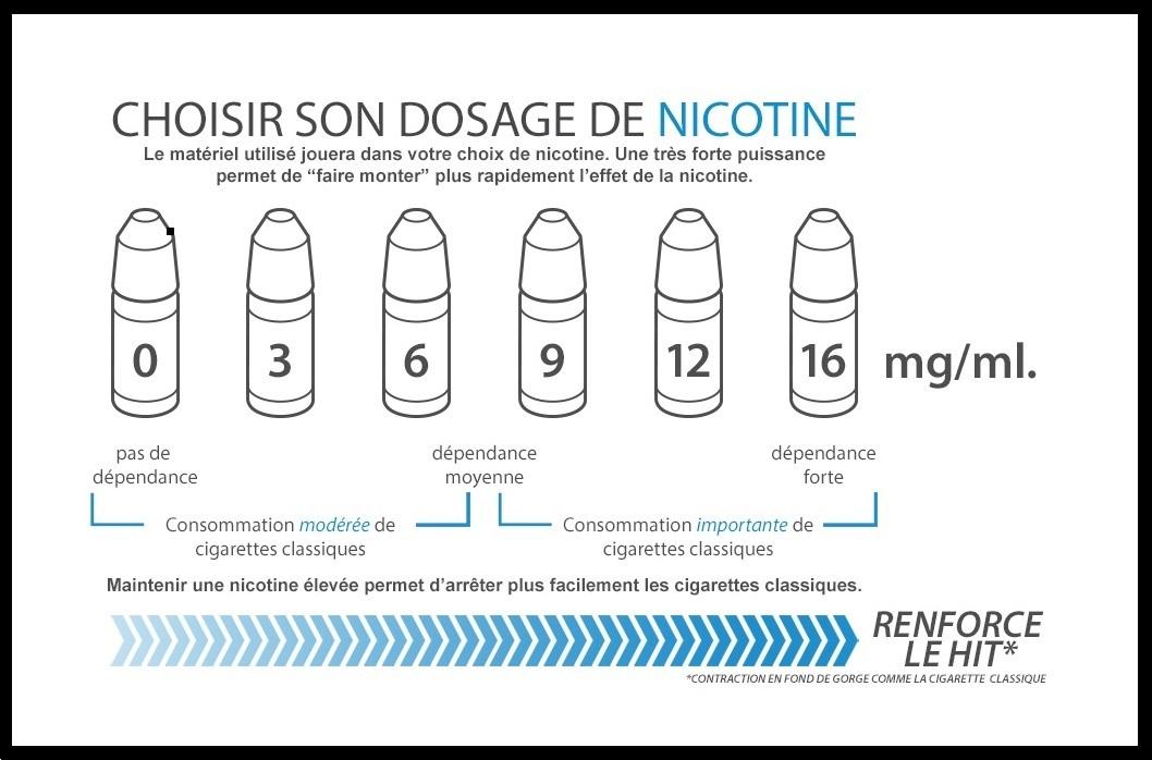 - Éventuellement de la nicotine. Non obligatoire, la nicotine produit également une sensation de hit. Son taux apparaît en mg/ml. Le hit joue dans une logique de sevrage tabagique. On conseille généralement aux gros fumeurs de commencer avec des liquides à haut ou moyen taux nicotinique ( 12 à 20 mg/ml) avant de baisser progressivement. Aux petits ou non-fumeurs, on recommande de prendre un petit taux voire un e-liquide sans nicotine (de 0 à 12 mg/ml).