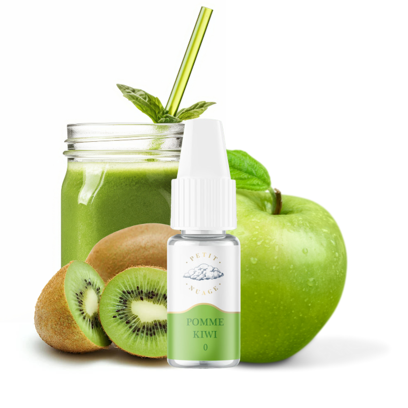 Vapez un smoothie intense aux arômes de pomme verte et de kiwi avec l'e-liquide Pomme Kiwi 10 ml, une création qui décoiffe imaginée par les aromaticiens de chez Petit Nuage !