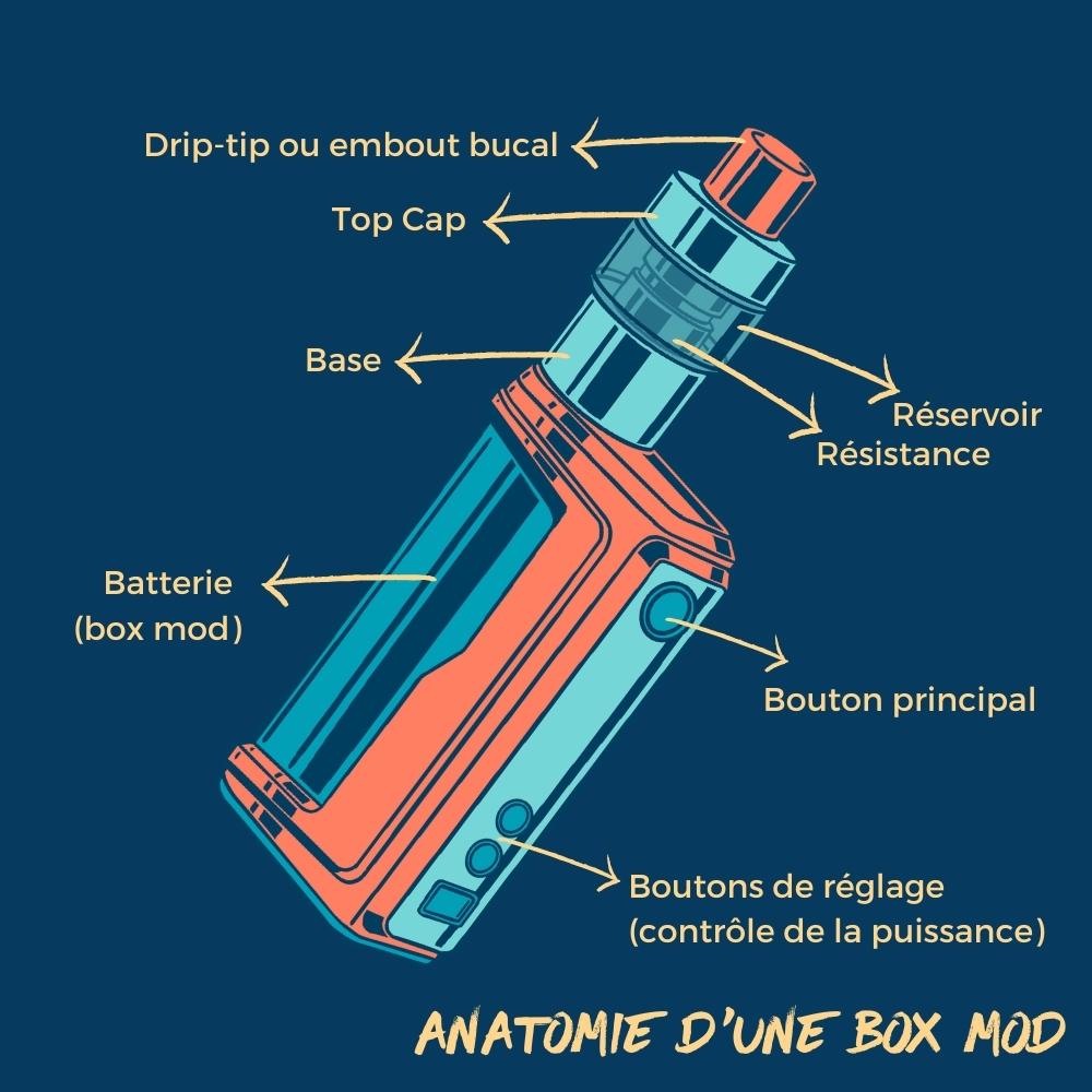 Contrairement aux modèles plus simples, le kit Box Mod se présente généralement sous la forme d'un boîtier rectangulaire, d'où son nom "box", équipé d'une batterie rechargeable intégrée ou amovible (accus) de grande capacité et associé avec un clearomiseur ou un atomiseur reconstructible.
