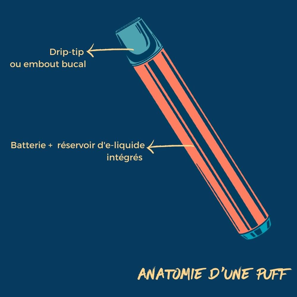 La puff est une cigarette électronique jetable vendue préremplie en e-liquide (nicotiné ou non) et dispose d’une batterie intégrée qui lui permet de délivrer un certain nombre de “puffs”.