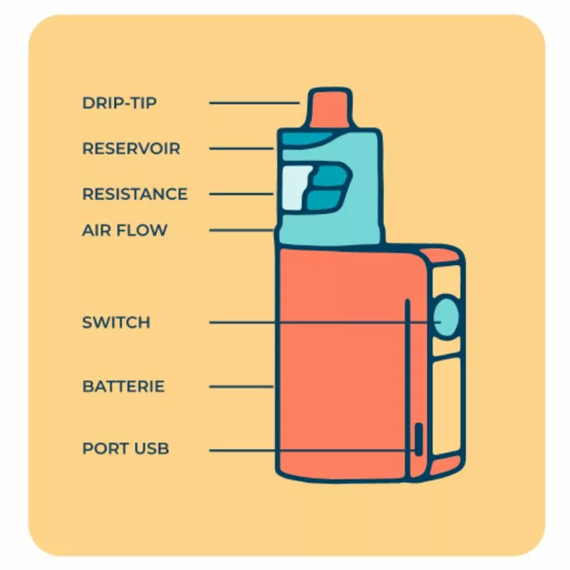 Le fonctionnement général d'une cigarette électronique est simple : elle est composée d'une batterie rechargeable, d'un réservoir ou d'une cartouche contenant l'e-liquide, et d'une résistance. Lorsque l'utilisateur appuie sur le bouton ou inhale par l'embout buccal, la batterie active la résistance, qui chauffe rapidement l'e-liquide jusqu'à l'ébullition.