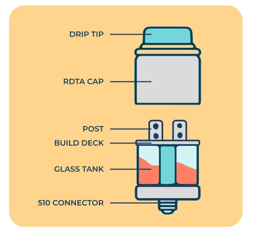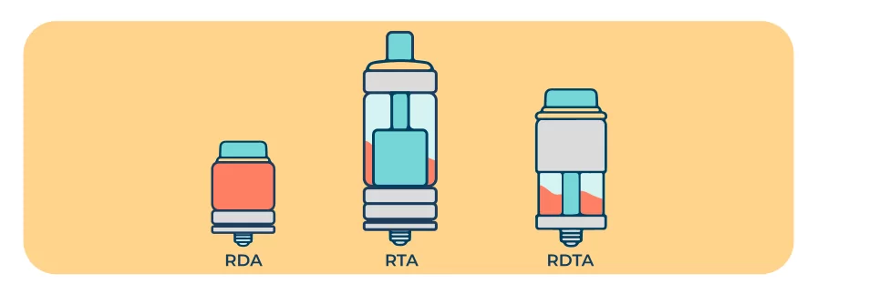 Hybride entre un RTA et un RDA, le RDTA (Rebuildable Dripping Tank Atomizer) est tout simplement un dripper sous lequel a été ajouté un réservoir. Le plateau est donc situé au-dessus du réservoir et comprend des ouvertures où s'introduisent les mèches de coton pour être imbibées. Un système d'alimentation en e-liquide via des câbles en acier existe également pour améliorer la capillarité et éviter tout « dry-hit ».