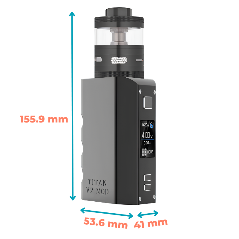 La box Titan V2 est équipée d’un mode voltage variable unique, permettant un contrôle précis de la tension de 0,1 V à 8,4 V, pour une puissance maximale de 300 W. Ce mode assure des performances stables même avec des résistances ultra-basses (jusqu’à 0,06 Ω). L’atomiseur Titan RDTA V2, avec son réservoir gigantesque pouvant passer de 20 à 32 ml, est conçu pour des séances de vape prolongées sans rechargement. Compatible avec des montages reconstructibles triple coils, il offre une expérience sur mesure, alliant production de vapeur massive et restitution exceptionnelle des saveurs.