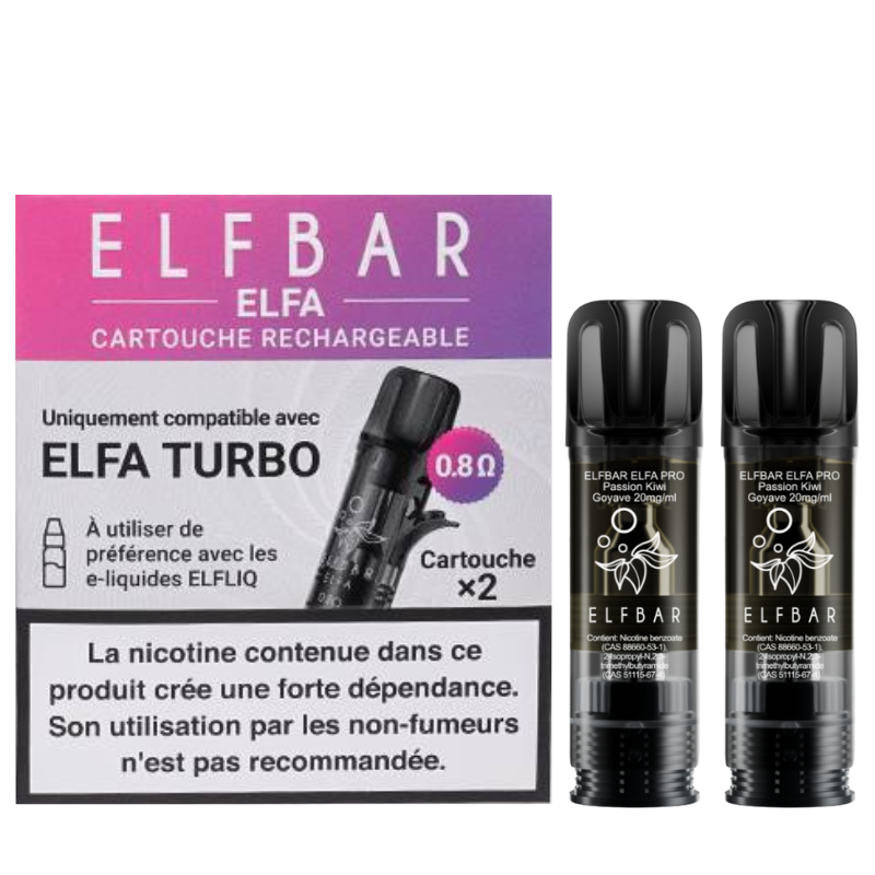 Les cartouches ELFA Turbo sont spécialement conçues pour fonctionner avec la batterie ELFA Turbo d’Elfbar. Chaque cartouche dispose d'une capacité de 2 ml et intègre une résistance mesh scellée de 0.8 ohm ou 1.1 ohm, idéale pour une vape douce en inhalation indirecte (MTL) tout en maximisant les arômes.