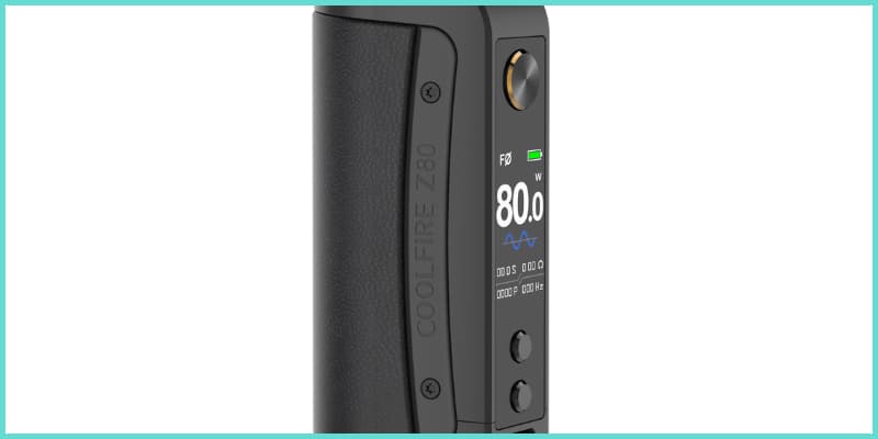 Avec sa vitesse de déclenchement ultra rapide de 0,003 secondes et une puissance de sortie allant jusqu'à 80W, la Coolfire Z80 impressionne. Dotée d'un mode FØ développée par Fourier, la chauffe de la résistance est assurée par un courant alternatif. La box peut ainsi être réglée entre 20 et 50 Hz pour une vape en inhalation directe, et entre 51 et 100 Hz pour une vape en inhalation indirecte.