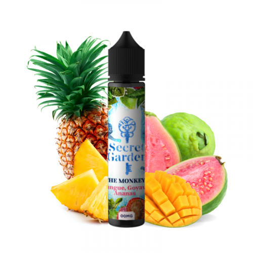 Trio de fruits en vue avec The Monkey, un e-liquide grand conditionnement de la gamme Secret Garden imaginée par les aromaticiens de la marque Secret's Lab ! Aspirez... et vapez de l'arôme de mangue bien mûre, de goyave à la chair rose et d'ananas sucré !