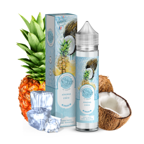 Découvrez l'e-liquide grand conditionnement Ananas Coco Frais 50 ml ! Les aromaticiens de la marque française Le Petit Verger réinventent leur recette composée d'arômes d'ananas sucré et de lait de coco en y ajoutant une généreuse dose de fraîcheur !