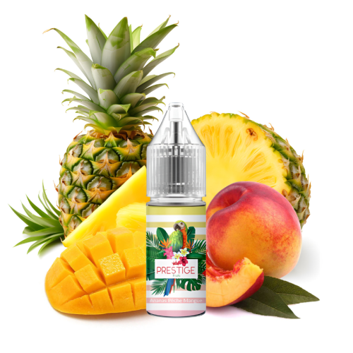 Prestige Fruits vous propose sa gamme d'e-liquides aux sels de nicotine, une façon particulièrement efficace et rapide de répondre à ses besoins nicotiniques ! Avec Ananas Pêche Mangue 10 ml Nic Salt, vapez un trio d'été fruité et ensoleillé, saveur ananas, pêche et mangue !