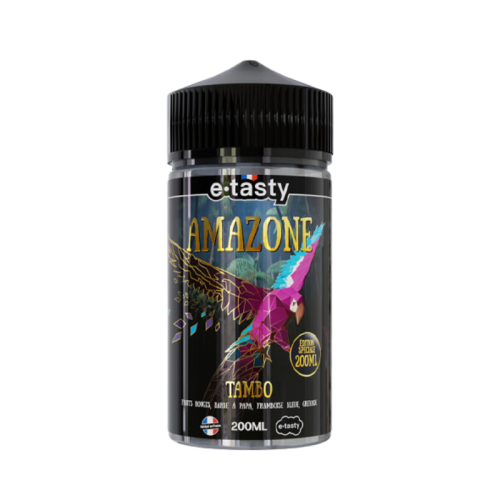 Avec l'e-liquide Tambo 200 ml Édition Spéciale de la gamme Amazone par E.Tasty, vapez un arôme frais, fruité et sucré de fruits rouges, de pulpe de grenade, de framboises bleues et de barbe à papa bien sucrée !