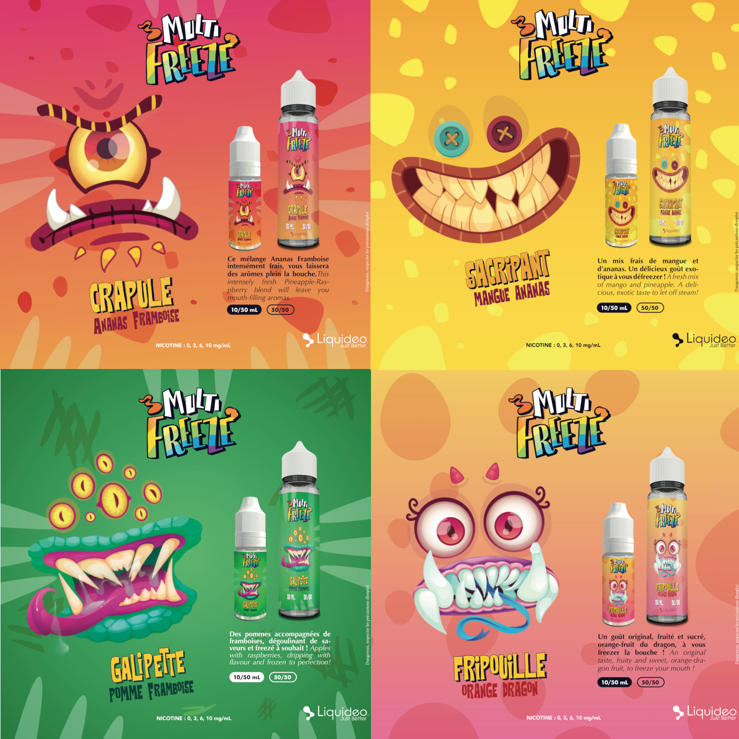 Conçus en région parisienne dans les laboratoires spécialisés de Liquideo, ces eliquides ont été pensés et réalisés en France par des aromaticiens professionels. En outre, les eliquides Multi Freeze respectent toutes les normes européennes en vigueur et ne contiennent ni dyacétile, ni sucralose, ni alcool. Ils sont également sans gluten pour ceux qui y sont intolérents.