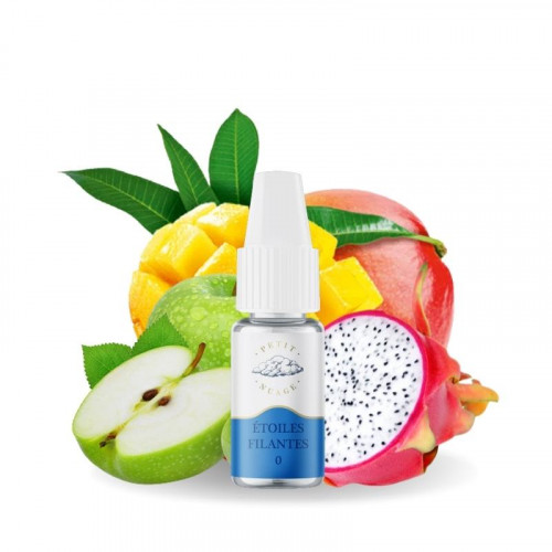 Étoiles filantes de Petit Nuage est un e-liquide fruité au goût de pomme, de mangue et de fruit du dragon.