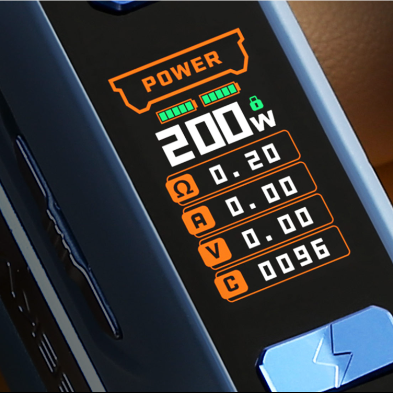 Imposant, l'écran présente à son utilisateur toutes les informations indispensables de façon extrêmement claire : mode de vape choisi, niveau restant des deux accus mis en place, puissance en watts, valeur de la résistance de l’atomiseur associé en ohm, intensité délivrée en ampère, tension exprimée en volt et nombre de puffs effectuées, sont autant de données consultables en un coup d’œil !