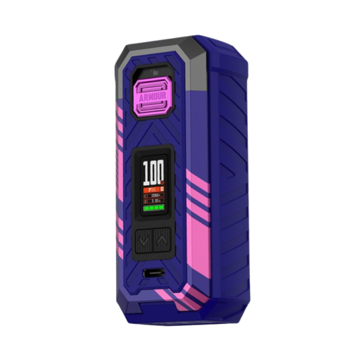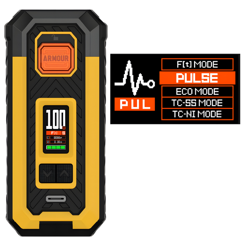 À l'aide d'un simple accu 18650 ou 21700 (non fourni) permettant d'activer un chipset Axon fiable et réactif, l'Armour S peut envoyer une puissance maximale de 100 watts tout en vous proposant un écran TFT couleur de 0,96" intuitif et à la lisibilité parfaite. Grâce à ce dernier ainsi qu'à la présence de deux boutons de réglages confortables et d'un imposant switch, vous pourrez sélectionner le mode de vape qui convient le plus à votre envie du moment, entre TC, Pulse, Eco ou F(t) !