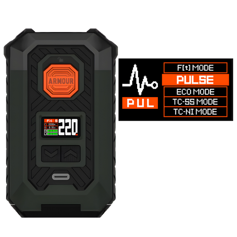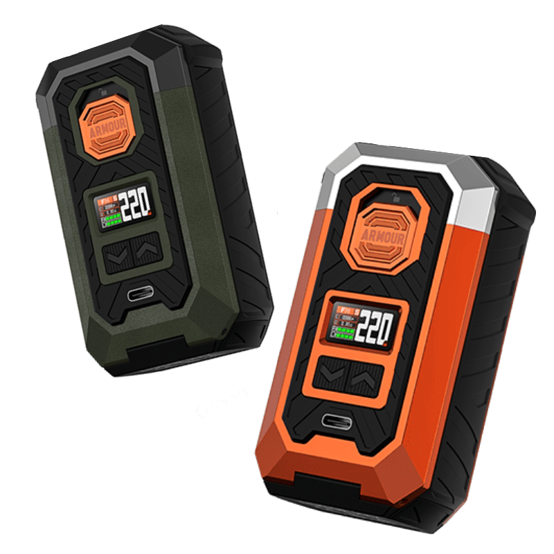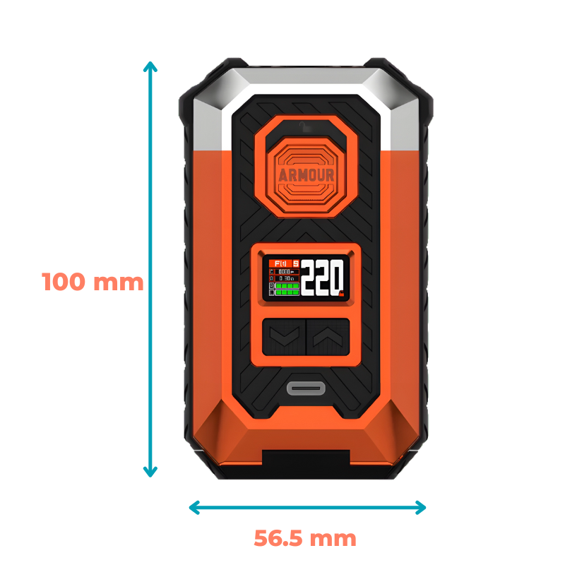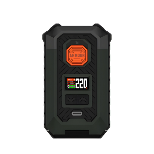 Fonctionnant avec deux accus 18650 ou 21700 (non inclus), cette box électronique est gérée par le chipset Axon, fiable et réactif à la fois. L'Armour Max peut envoyer jusqu'à 220 watts de puissance et dispose d'un écran couleur TFT de petite taille mais intuitif et parfaitement lisible. Ce dernier, ainsi que la présence de deux boutons de réglage confortables et d'un switch impressionnant, vous permettent de choisir le mode de vape qui correspond le mieux à vos envies du moment, entre TC, Pulse, Eco ou F( t) !