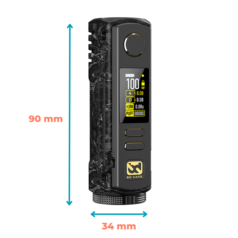 Avec une puissance réglable jusqu'à 100 watts, elle permet des sessions de vape intenses et personnalisées grâce à son chipset avancé, qui ajuste précisément la sortie de puissance selon les préférences de l'utilisateur. L'écran OLED personnalisable facilite la navigation, tandis que le port USB-C et la compatibilité avec des accus 18650 comme 21700 (non inclus) garantissent une utilisation prolongée et un rechargement rapide.
