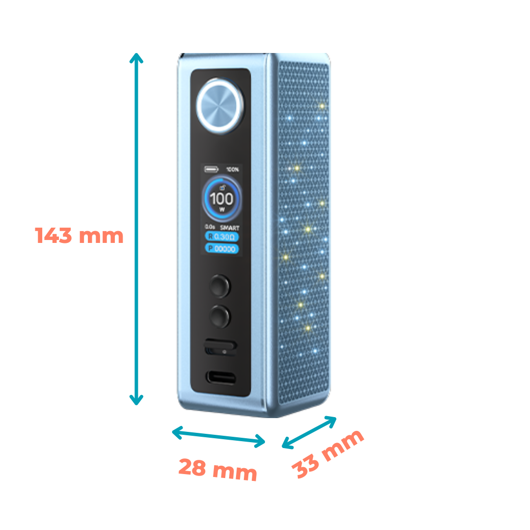 Son écran TFT couleur de 0,96 pouces affiche clairement toutes les informations essentielles et propose deux thèmes d’interface animés, pour une navigation fluide et intuitive. Mais ce n’est pas tout ! Son alliage de zinc léger cache une véritable innovation visuelle : 144 LEDs intégrées qui illuminent la box avec des animations dynamiques à chaque bouffée.