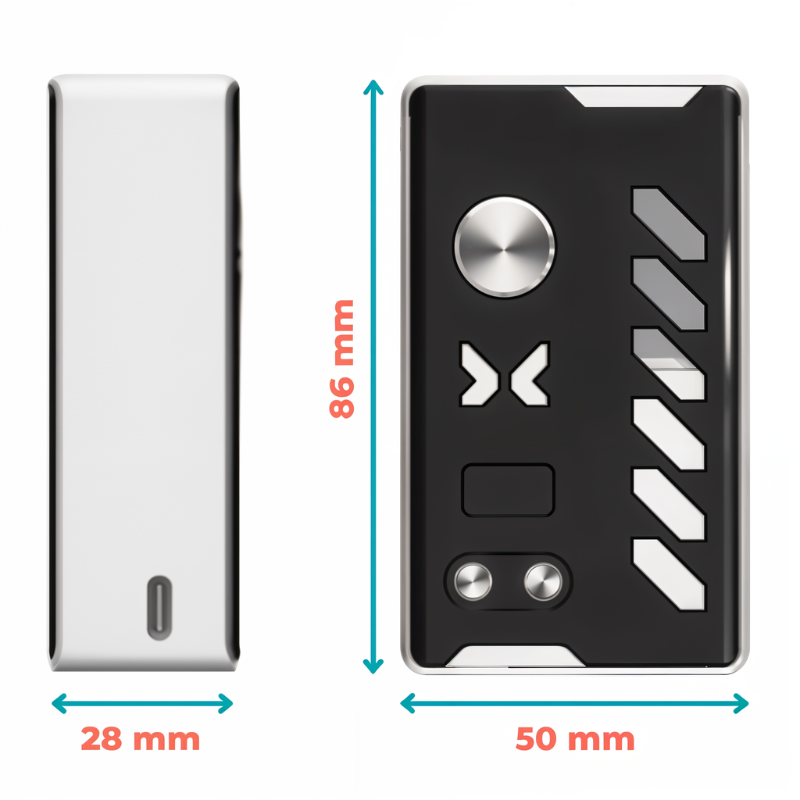 Avec des dimensions de 86 x 50 x 28 mm et un poids de 138 g, cette box est particulièrement compacte et ergonomique. Elle intègre une bouteille squonk en silicone souple de 6,5 ml, assurant une alimentation fluide en e-liquide. Compatible avec des atomiseurs jusqu'à 26 mm de diamètre, elle s'adapte à une large gamme de configurations.