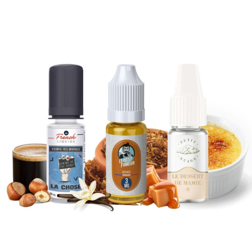Le Petit Fumeur a créé spécialement pour vous un pack de 3 e-liquides saveurs gourmandes afin de vous faire découvrir les meilleurs e-liquides de leur catégorie ! Profitez d'une expérience de vape sucrée et savoureuse avec des arômes de classic blond vanillé caramélisé, de crème brûlée et de café accompagné de noisettes grillées !