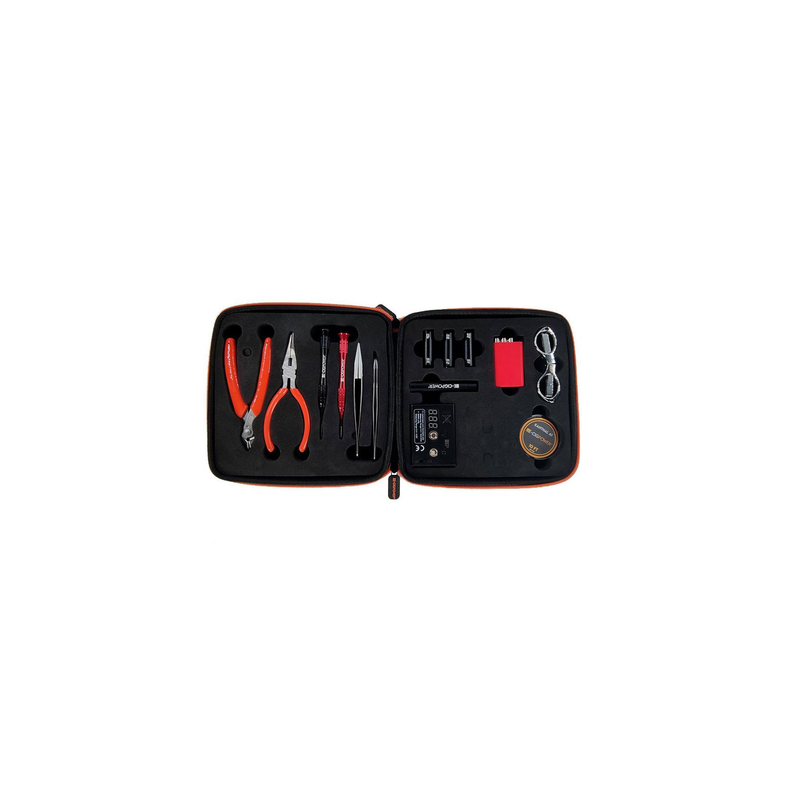 - 1 Tool Kit Essential - E-Cig Power : le Tool kit Essential E-Cig Power comprend tous les outils nécessaires pour construire ses propres résistances avec précision et exactitude ! Il comprend une pince diagonale, une pince à becs pointus, des ciseaux pliants en acier inoxydable, un tournevis Phillips et un tournevis à tête plate en forme de stylo, une pince à épiler en céramique (T1), une pince à épiler angulaire (T3) équipée de capuchons de protection en caoutchouc, 10 pieds de fil Kanthal A1 24 GA, un ohmmètre, un kit de bobinage V4 et un étui en caoutchouc de silicone.