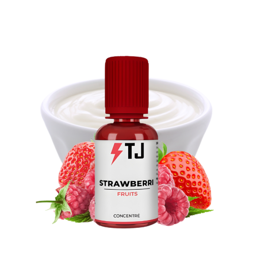 Préparez votre propre e-liquide DIY aux arômes de fraises et de framboises au jus sucré nappées d'une onctueuse crème fraîche avec le concentré Strawberri 30 ml de la marque anglaise T-Juice !