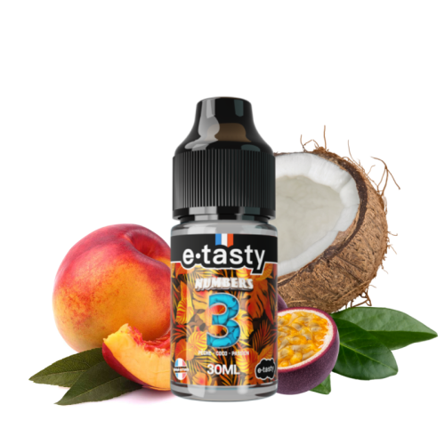 Avec le concentré 3 30 ml, la marque française Numbers créée par E-Tasty vous propose de préparer un e-liquide DIY aux arômes fruités de pêches juteuses, de noix de coco et de fruits de la passion acidulés !