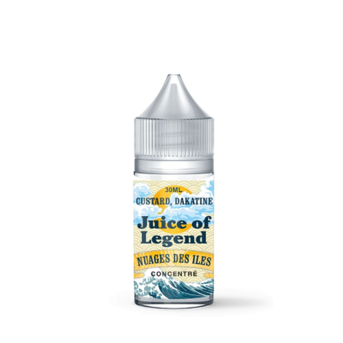 Découvrez Juice of Legend 30 ml, un concentré de la marque Nuage des Iles aux arômes de crème vanillée accompagnée de beurre de cacahuètes et d'une généreuse banana split !