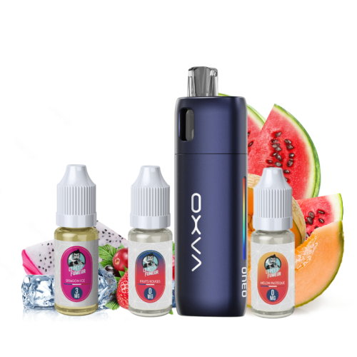 Pack tout compris pour une vape clé en main comprenant un kit Oneo OXVA ainsi qu'un lot de 3 e-liquides fruités/frais Le Petit Fumeur format 10 ml, déclinés en différents taux de nicotine.
